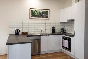 Our 2 bedroom accommodation, Keppel and Lake Mountain, can accommodate a maximum of 4 guests including adults, children and infants. This makes them the perfect size for a family of four, or two couples. Each house has 72sqm of floorspace, open plan living with flatscreen internet-ready TV, a fully equipped kitchen, dining seating for 6, one king bedroom and one twin bedroom with single beds, plus a sunny balcony with outdoor seating.